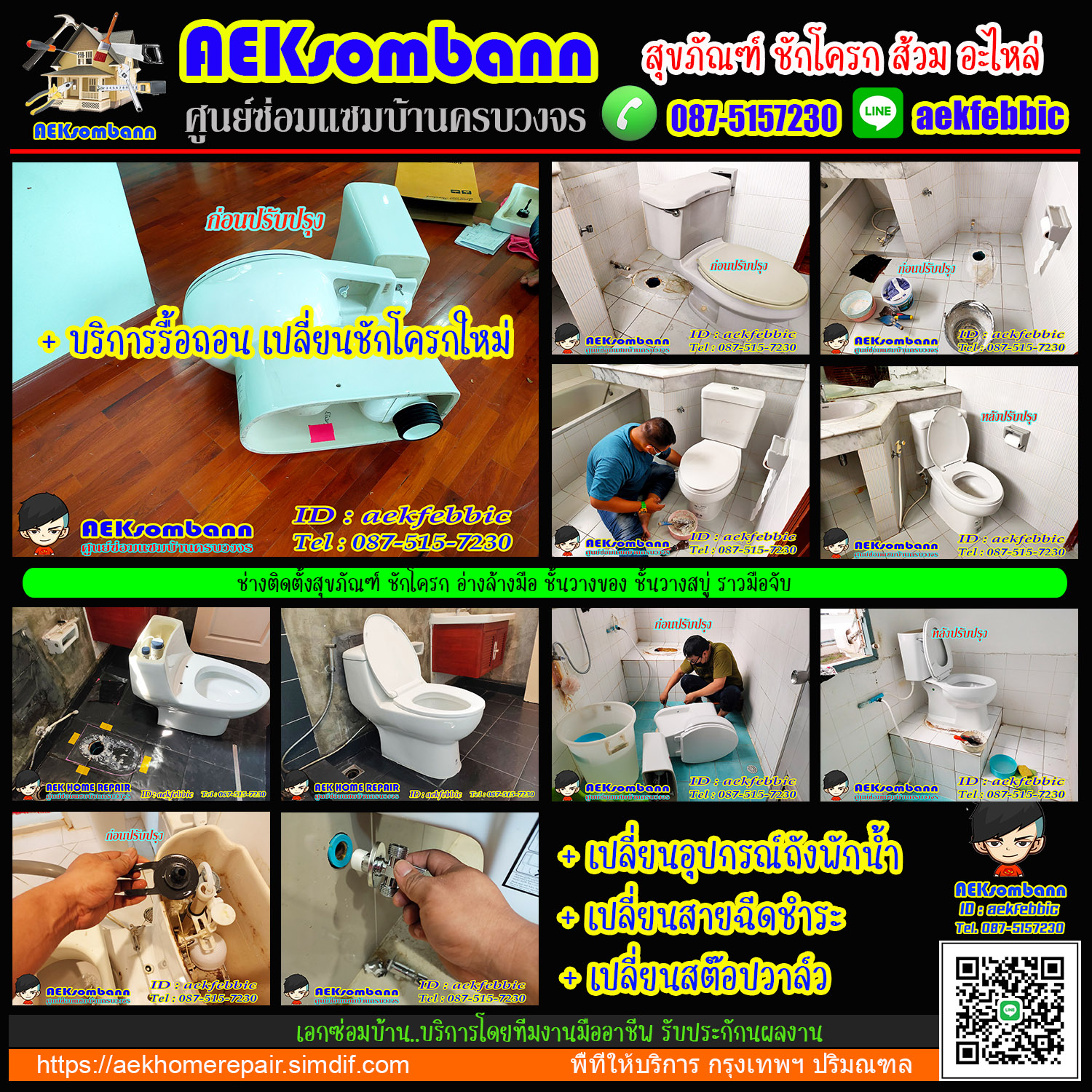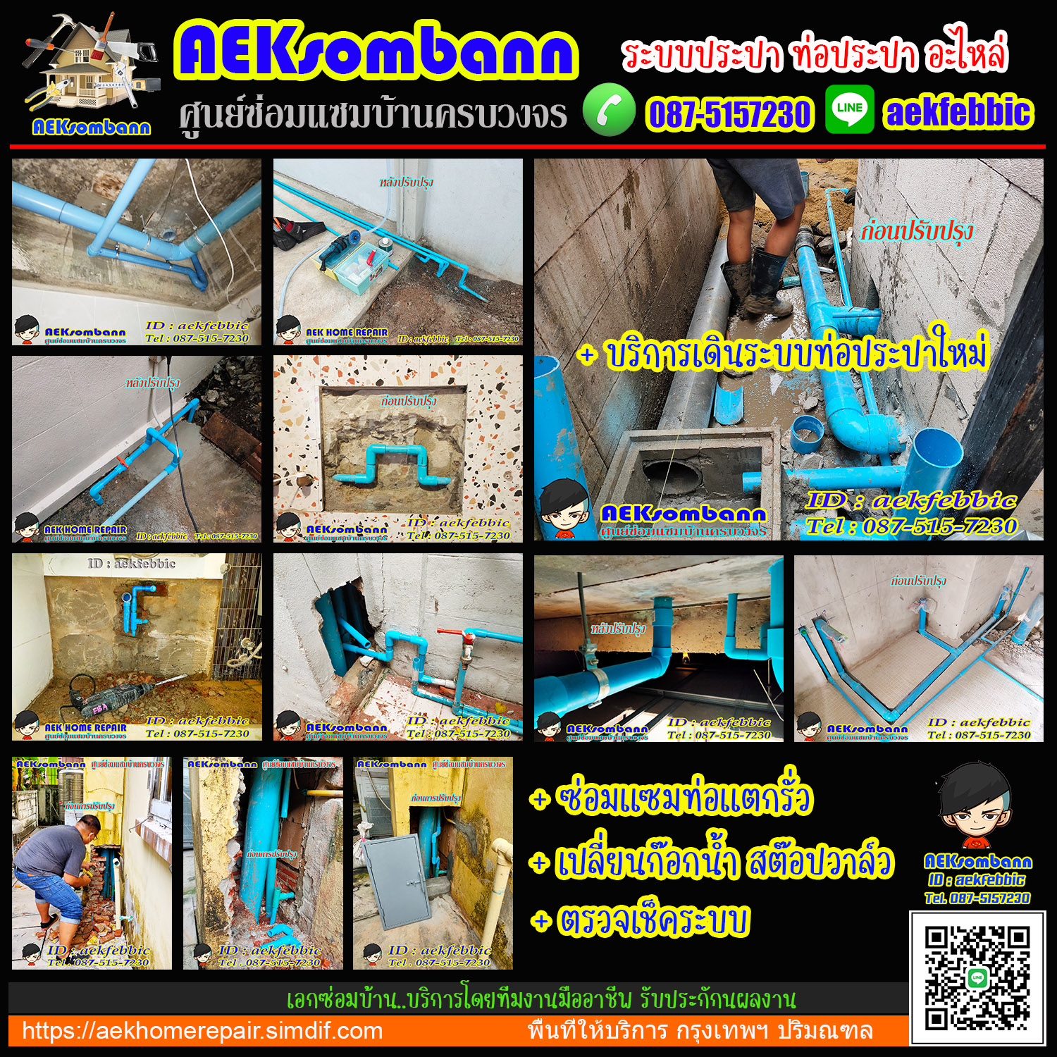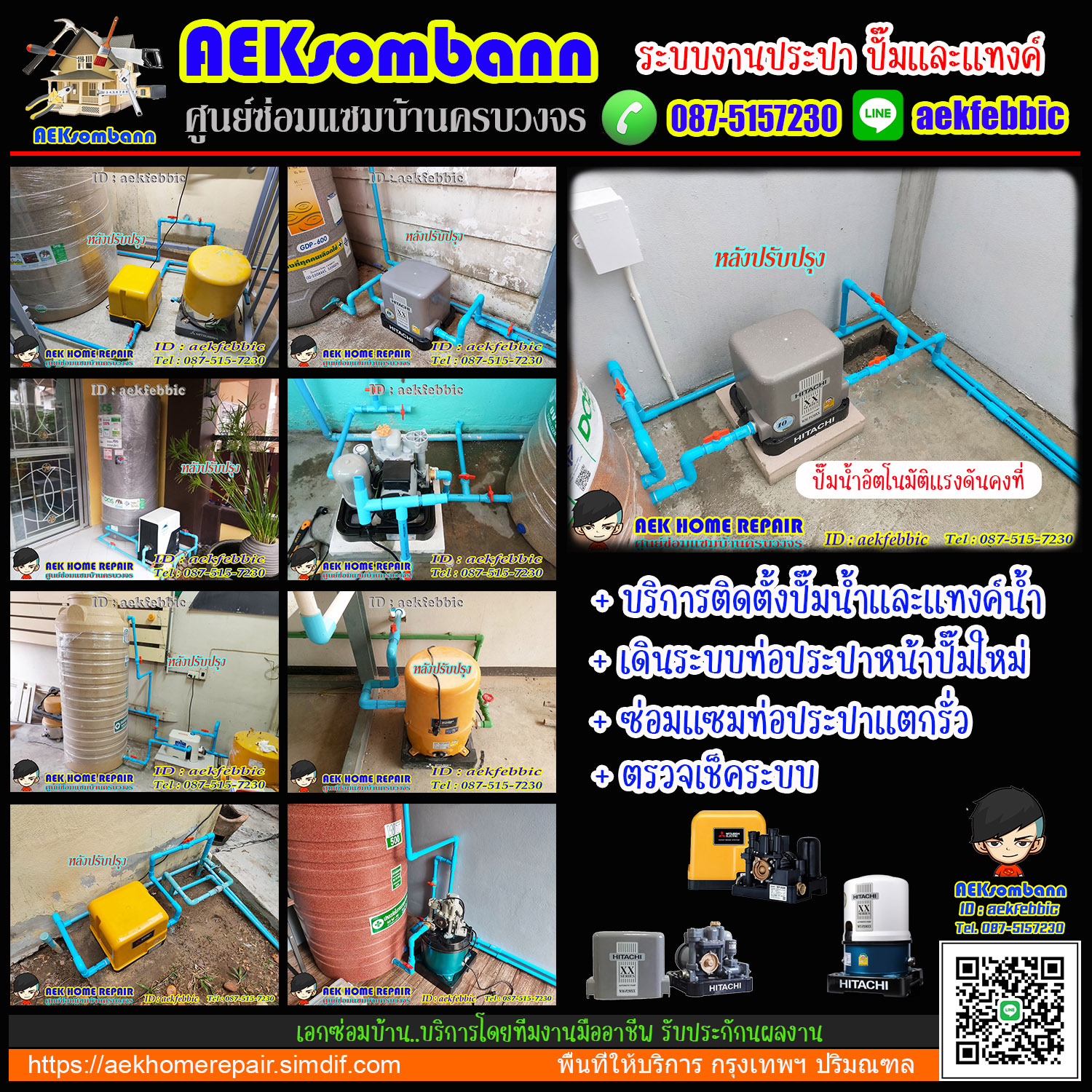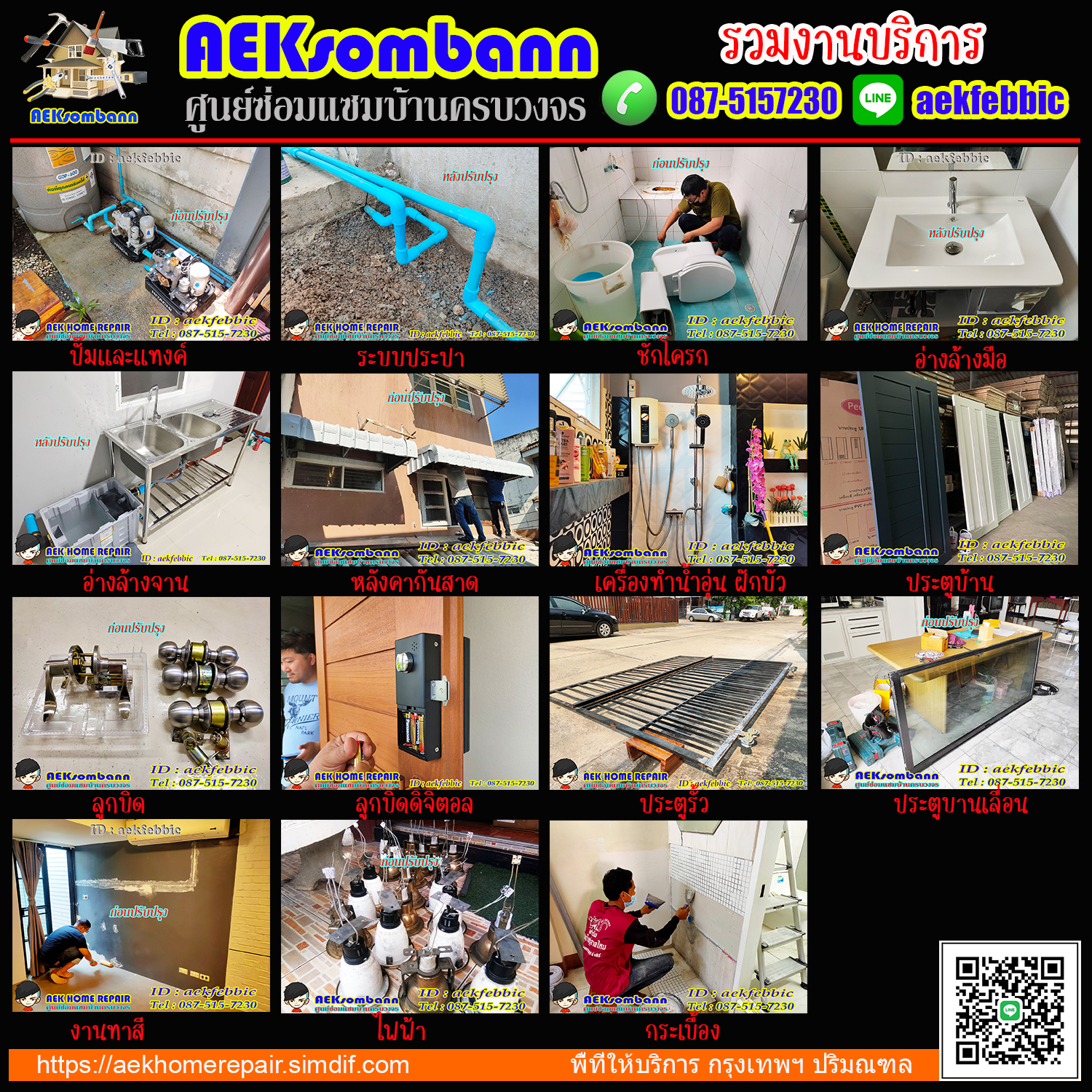 AEKsombann ให้บริการแก้ไข ปรับปรุง ต่อเติม ซ่อมแซมระบบต่างๆ ภายในบ้านและคอนโด เช่น ระบบงานประปา ติดตั้งปั๊มน้ำ ติดตั้งสุขภัณฑ์ ติดตั้งและเปลี่ยนอุปกรณ์ อ่างล้างมือ อ่างล้างจาน รับงานติดตั้งซ่อมแซมประตูบ้าน ประตูห้อง ประตูรั้ว ประตูกระจกบานเลื่อน งานติดตั้งและเปลี่ยนลูกบิดทุกชนิด งานทาสี งานปูกระเบื้อง งานไฟฟ้า งานติดตั้งเครื่องทำน้ำอุ่น งานเปลี่ยนก๊อกน้ำ สต๊อปวาล์ว สายน้ำดี ชุดฝักบัว Rain shower งานติดตั้งซ่อมแซมหลังคากันสาด และอื่นๆ